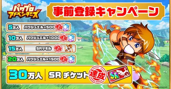 パワプロアドベンチャーズのリセマラで使えるリソースは、思った以上にしっかり用意されています。まず大きいのが事前登録キャンペーンの報酬ですね。事前登録者数が5万人から20万人に到達した分で、パワージュエルが合計3,000個もらえるようになっています。さらに、SRチケットが1枚付いてくるので、これだけでも最高レアリティのキャラを1体確保できるチャンスがあるわけです。ソシャゲのリリース時にこれだけの石が初手で配られるのは、正直かなり良心的な方だと思います。