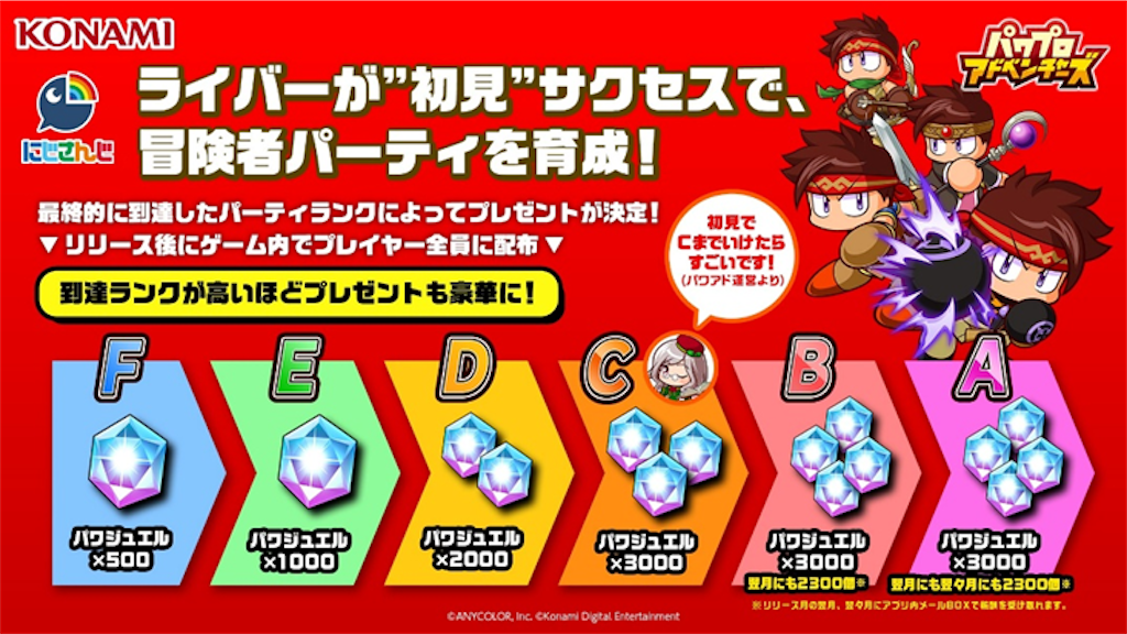 それに加えて、にじさんじとのコラボ配信の達成報酬としてパワージュエルがさらに3,000個手に入ります。このコラボ配信は5回分が実施されていて、各回の視聴や条件達成でジュエルが段階的にもらえる仕組みでした。つまり、リリース直後に受け取れるパワージュエルの合計は少なくとも6,000個以上になるということですね。